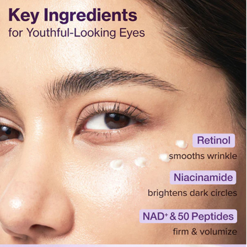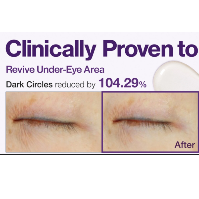 Clinicamente comprovado que melhora 5 tipos de rugas nos olhos (pés de galinha, linhas abaixo dos olhos, linhas profundas entre os olhos e as bochechas, linhas na parte interna dos olhos e rugas nas pálpebras superiores), restaurando o volume e a elasticidade das áreas oculares. Reduz visivelmente olheiras, hiperpigmentação e descoloração, para uma aparência mais iluminada e revigorada em apenas 4 semanas.